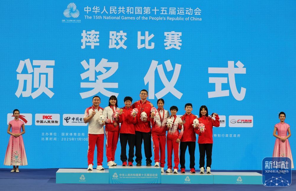 11月10日,第十五届全运会女子57公斤级摔跤自由泳铜牌及决赛在广东清远举行。最终,江苏队选手洪可欣获得冠军,广东队选手梁宏获得亚军,广东队选手冯永新、江苏队选手谢梦宇获得季军。 ↑ 冠军江苏队洪可欣(左四)、亚军广东队梁宏(左三)、季军广东队选手冯永新(右五)、江苏队选手谢梦宇(右二)在颁奖典礼上。 ↑ 江苏队球员洪可欣(前)庆祝胜利。最终,他击败广东队选手梁宏,夺得冠军。 ↑ 江苏队球员洪可欣与广东队球员梁宏(前)在决赛中。 ↑ 江苏队选手洪可欣(右)与广东队选手梁宏在决赛中。 ↑ 广东队球员冯永新(勒ft)赛后与吉林队球员冯嘉敏握手。最终冯永新获得第三名。 ↑ 广东队选手冯永新(左)和吉林队选手冯嘉敏获得铜牌。 ↑ 江苏队选手谢孟宇(下)和江西队选手邓娟获得铜牌。最终,谢孟宇获得第三名。 ↑ 江苏队球员谢孟宇(左)庆祝胜利。最终,他击败江西队选手邓娟,获得第三名。新华社记者 李然 摄