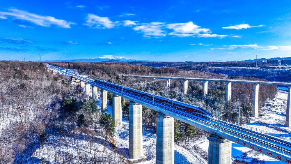 11月28日,一列复兴号动车组列车在沈嘉高铁沉白段穿越森林和雪原。 (陈明摄)