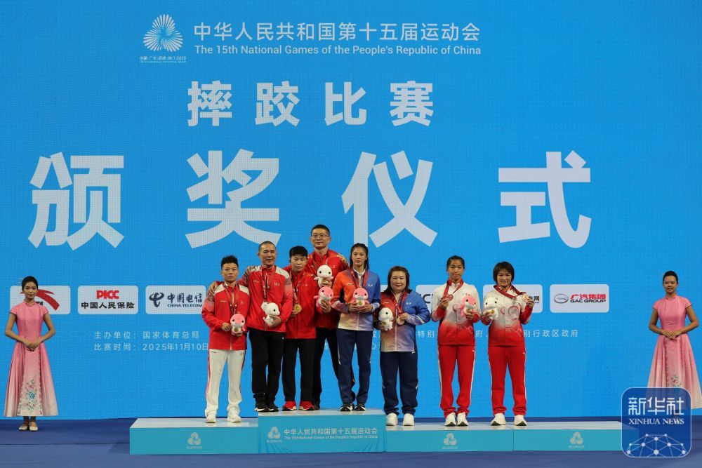 11月10日,第十五届全运会女子摔跤自由式53公斤级决赛暨铜牌在清远举行。最终,江苏队选手张晋获得冠军,湖南队选手庞前宇获得亚军,广东队选手罗兰暖、广西队选手李宇轩获得季军。 ↑ 江苏队冠军张晋(左四)、湖南队亚军庞千宇(左二)、广东队季军罗兰暖(右三)、广西队季军李雨轩(右五)与教练员在颁奖典礼上合影。 ↑ 江苏队冠军张晋(左五)、亚军湖南队选手庞千宇(左三)、广东队季军罗兰暖(右四)、广西队季军李玉轩(右六)与教练员在颁奖典礼上合影。 ↑ 江苏队球员张晋(右)与湖南队女子自由泳53公斤级决赛,选手庞倩雨。最终,江苏队选手张晋获得冠军,湖南队选手庞前宇获得亚军。 ↑ 女子自由泳53公斤级决赛中,江苏队选手张晋(左)与湖南队选手庞倩玉。 ↑ 广西队选手李玉轩(上)与贵州队选手江美伊夺得女子自由泳53公斤级铜牌。最终,李雨轩战胜姜美伊,获得铜牌。 ↑ 广西队选手李玉轩(左)与贵州队选手江美伊夺得女子自由泳53公斤级铜牌。 ↑ 王东队选手罗兰暖(右)与云南队选手刘玉娇夺得女子自由泳53公斤级铜牌。最终,罗兰暖击败刘玉娇,获得铜牌。新华社记者 李然 摄