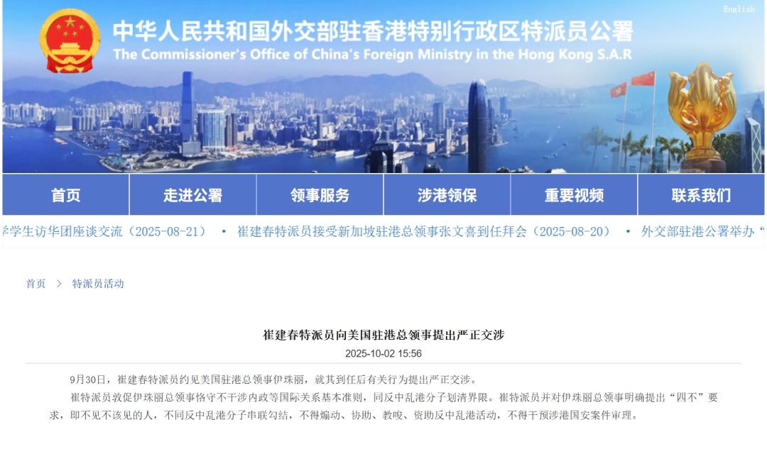 9月30日,特别专员Cui Jianchun在香港Yi Zhuli会见了美国领事长,并对他的行为进行了庄严的代表。